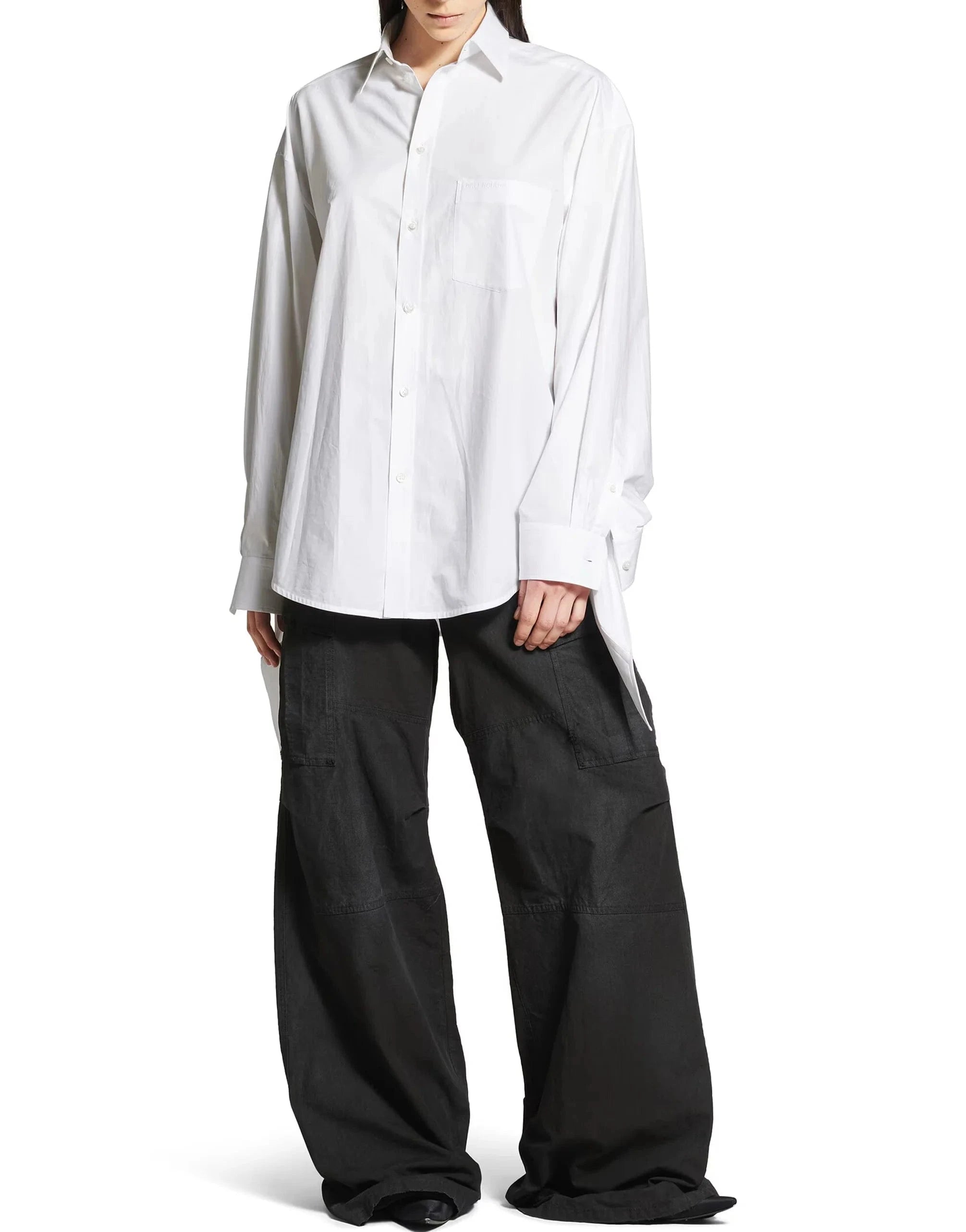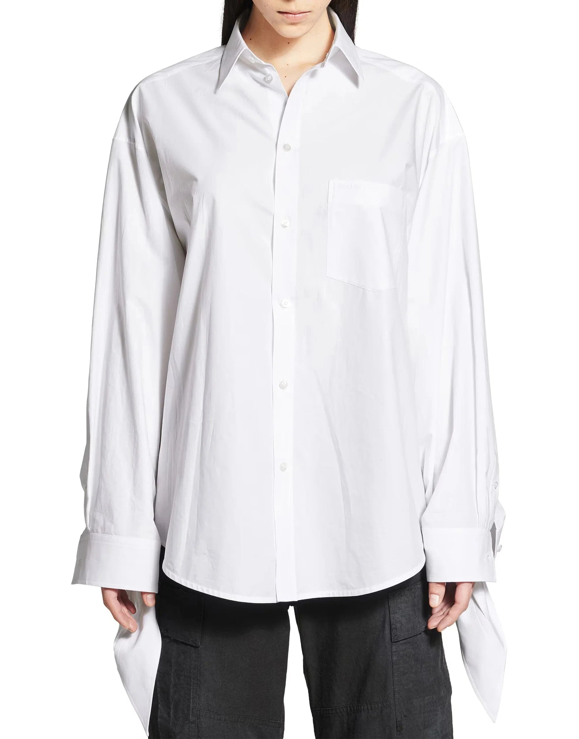 Crafted by Balenciaga, the Knotted Cuff Blouse redefines modern elegance with its oversized silhouette in regenerative cotton poplin. This Italian-made masterpiece features a classic collar, engraved buttons, and a subtly branded chest pocket, while its wide sleeves with adjustable knotted cuffs offer a distinctive touch. The rounded hem adds refinement, making this white blouse a timeless addition to any sophisticated wardrobe.