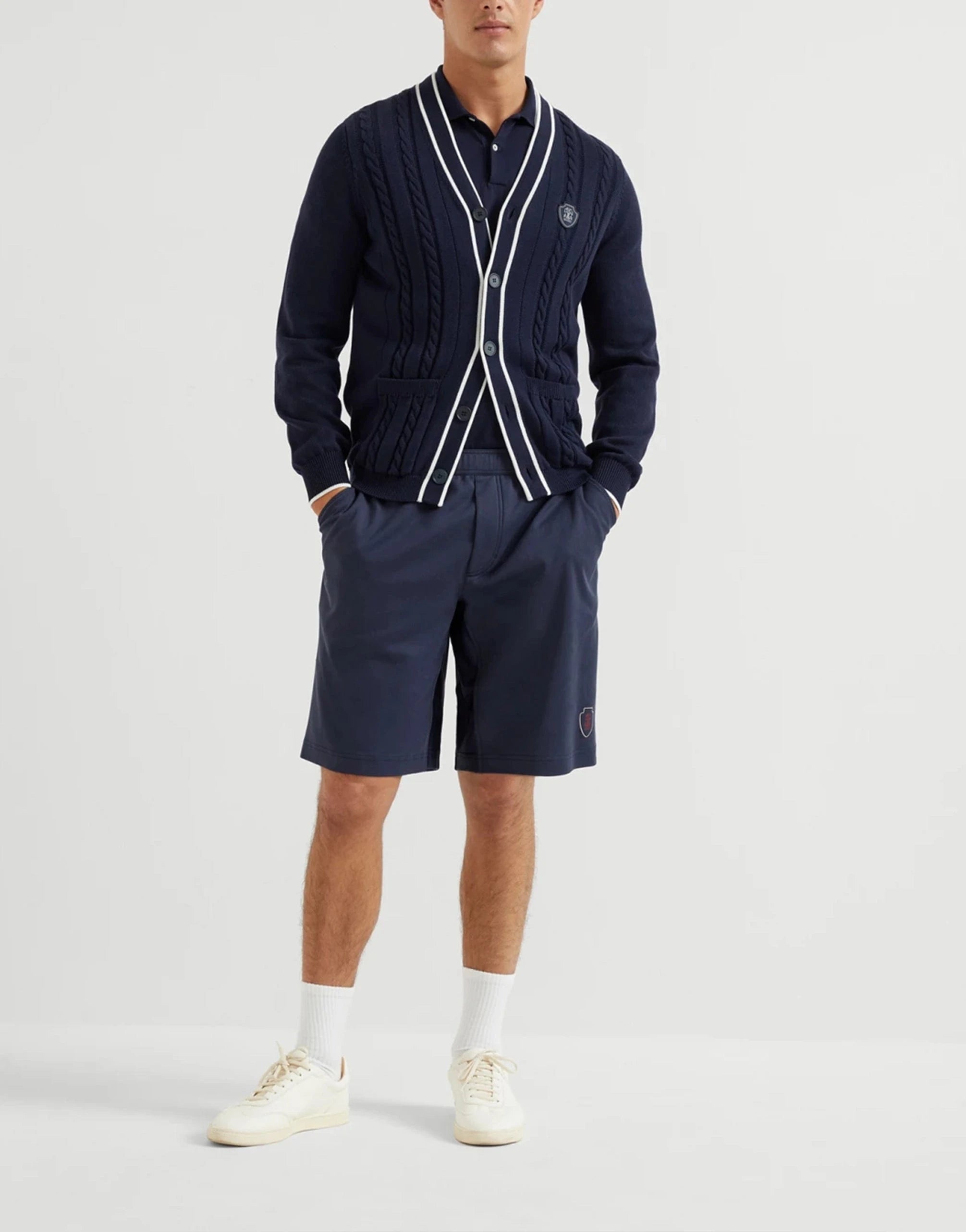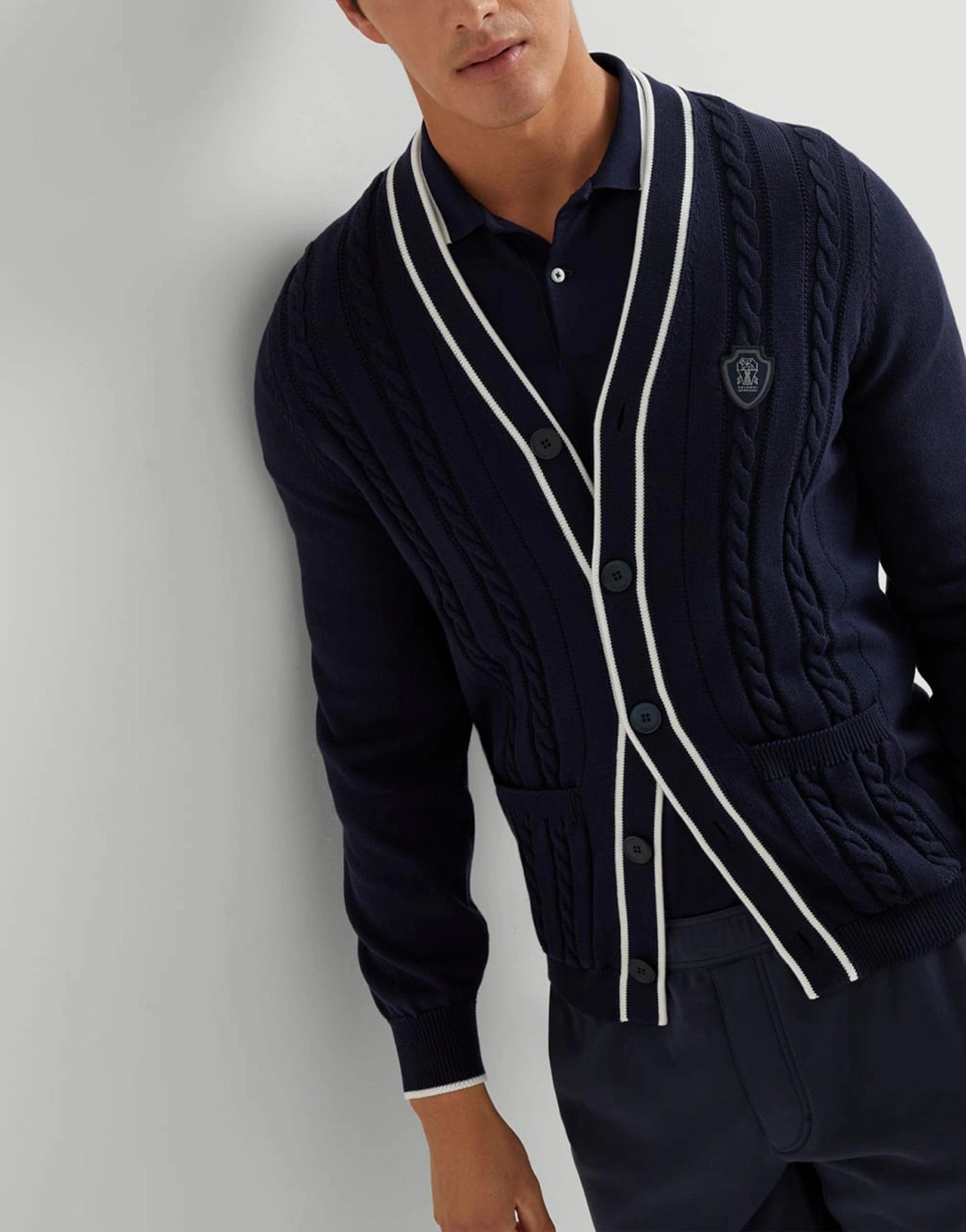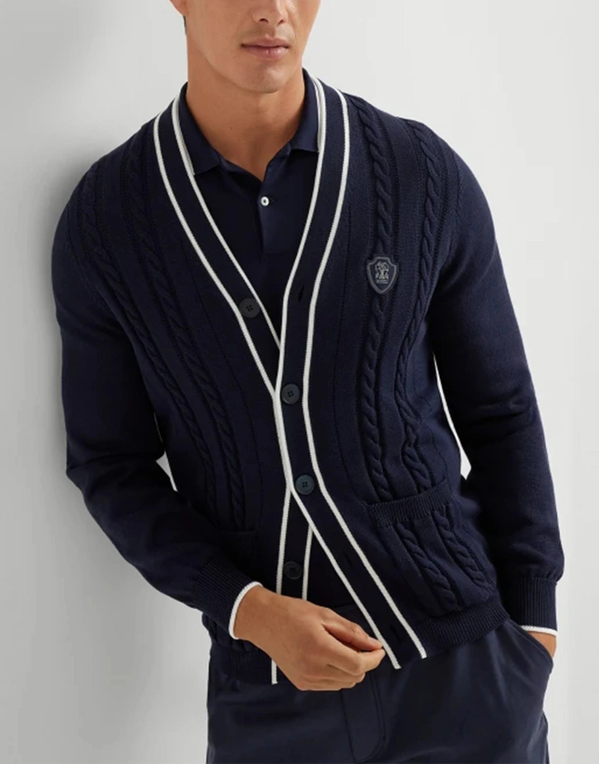 Brunello Cucinelli’s Cotton Cable Knit Logo Cardigan elegantly merges a sporty tennis-inspired aesthetic with the refined craftsmanship synonymous with luxury menswear. Crafted from pure cotton, this cardigan boasts a soft texture highlighted by intricate cable knitting, while contrasting edges and a heraldic logo subtly enhance its timeless appeal, making it a distinguished addition to any men's knitwear collection.