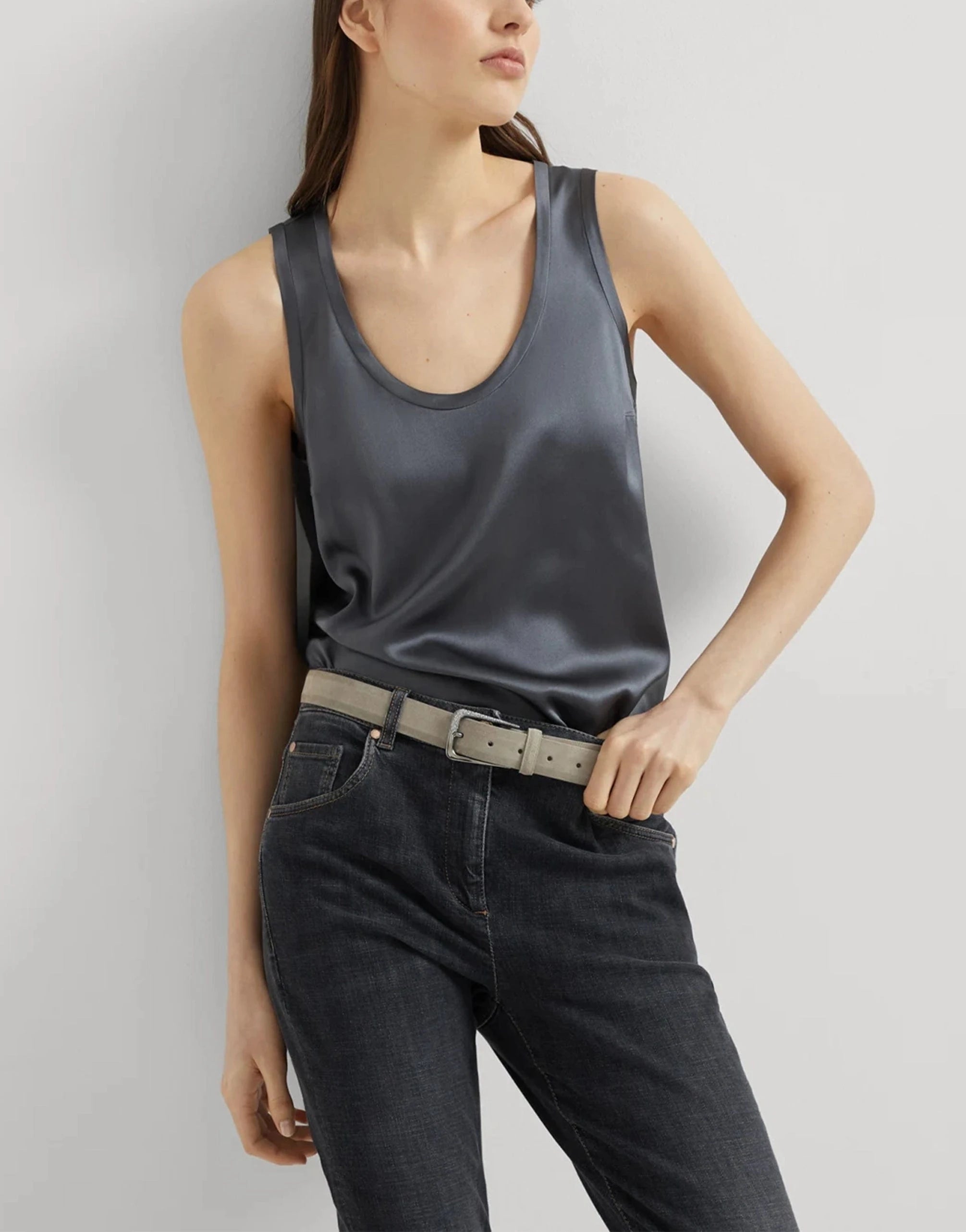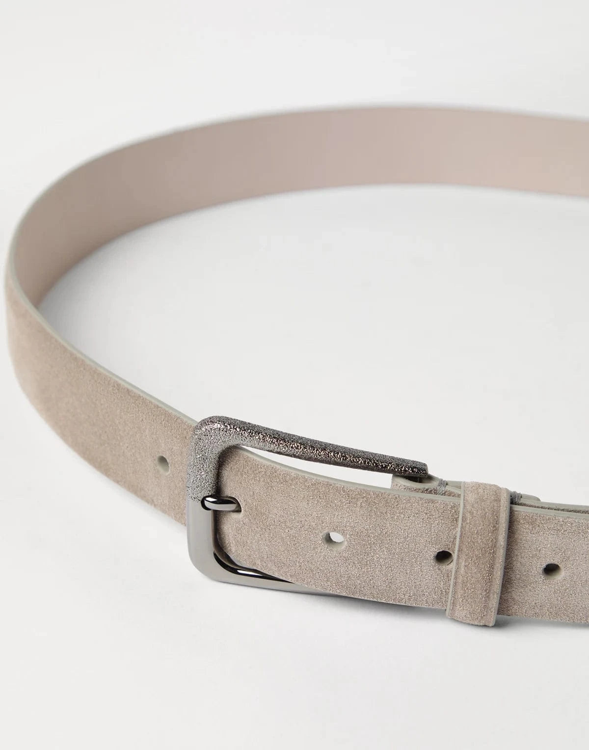 Brunello Cucinelli's grey suede belt is a testament to refined elegance, seamlessly blending sumptuous leather with the sleek, contemporary design of its square metal buckle. This women's accessory effortlessly elevates any ensemble, embodying the harmonious balance between timeless sophistication and modern allure.