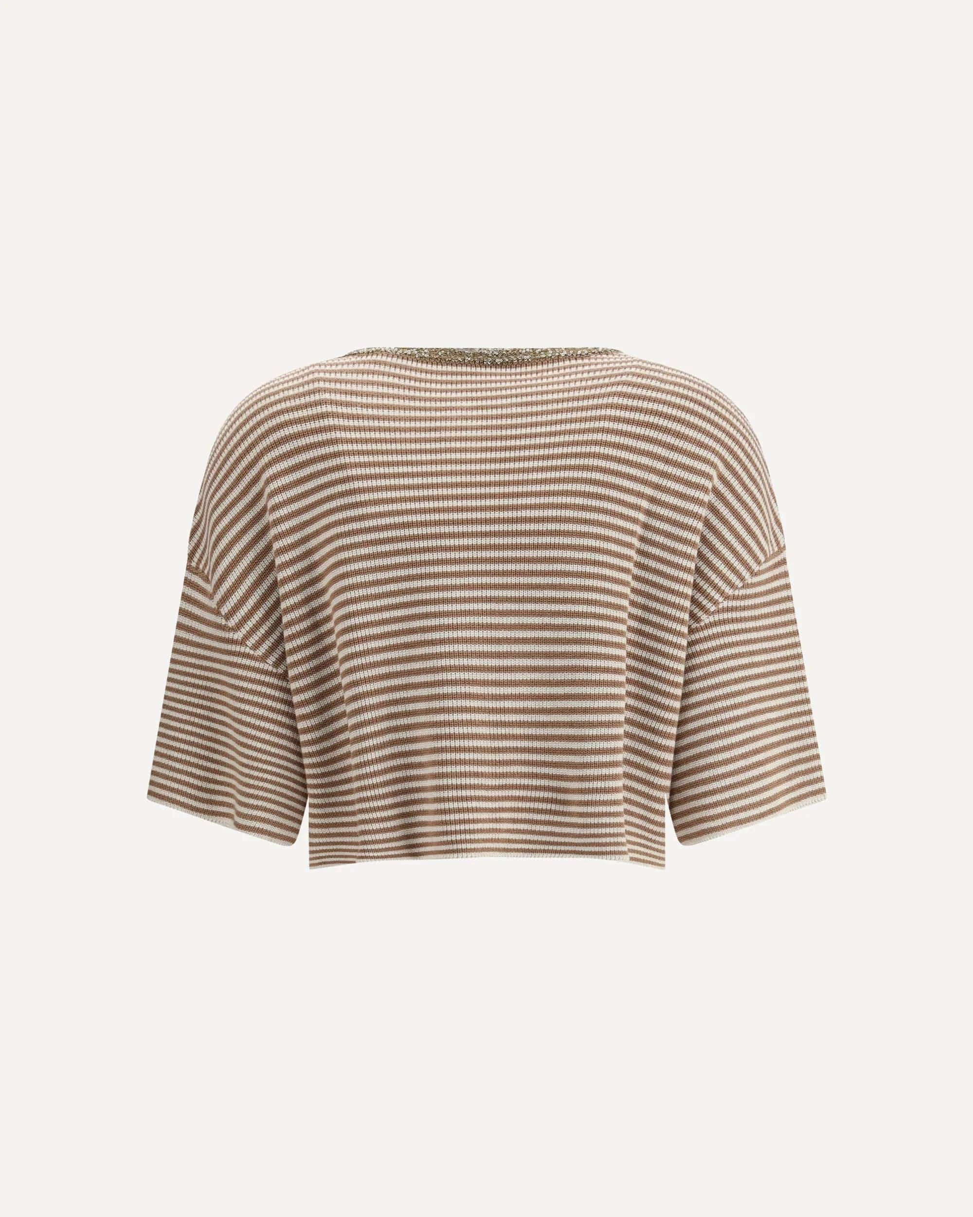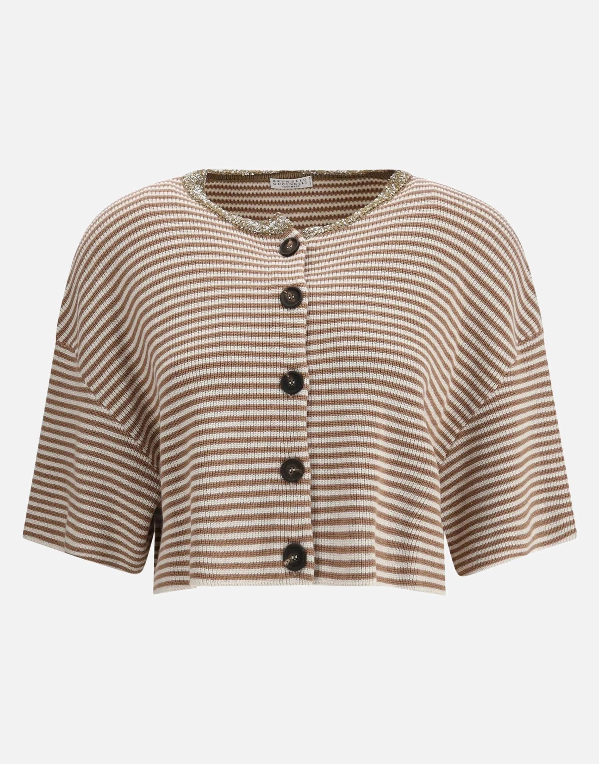 Brunello Cucinelli's Striped Monili Collar Cardigan exudes a sophisticated charm, effortlessly blending a summery striped pattern with the glimmering elegance of sequin-adorned detailing. Crafted from luxurious cotton, this women's cardigan features a relaxed fit with dropped shoulders, adding a touch of casual elegance to any wardrobe. An embodiment of refined femininity, it seamlessly marries comfort and style, perfect for those who appreciate timeless women's clothing with a contemporary twist.