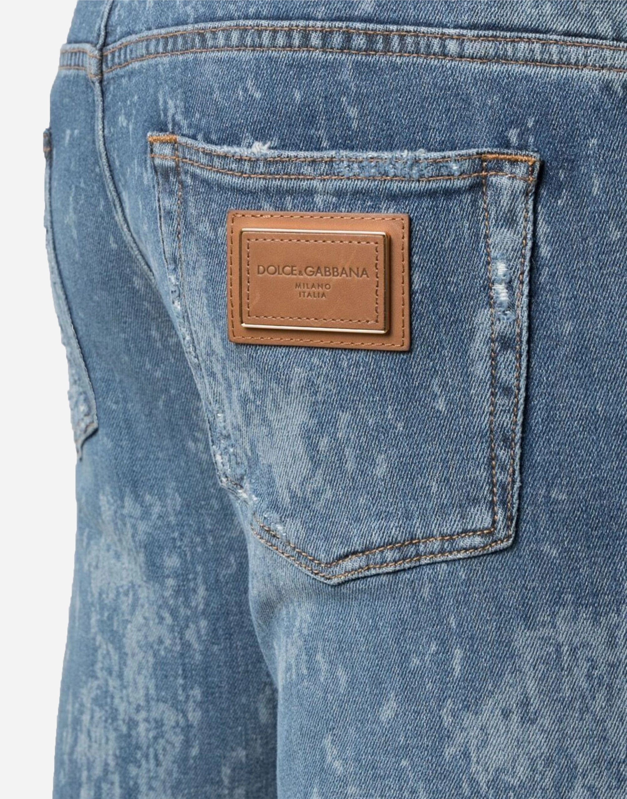Upgrade your denim game with these Bleached-Effect Slim-Fit Jeans from DOLCE & GABBANA. The blue stretch cotton fabric provides both comfort and style, while the bleach wash and distressed effect add a trendy touch. With a slim cut, raw edge, and cropped length, these jeans will elevate any outfit.