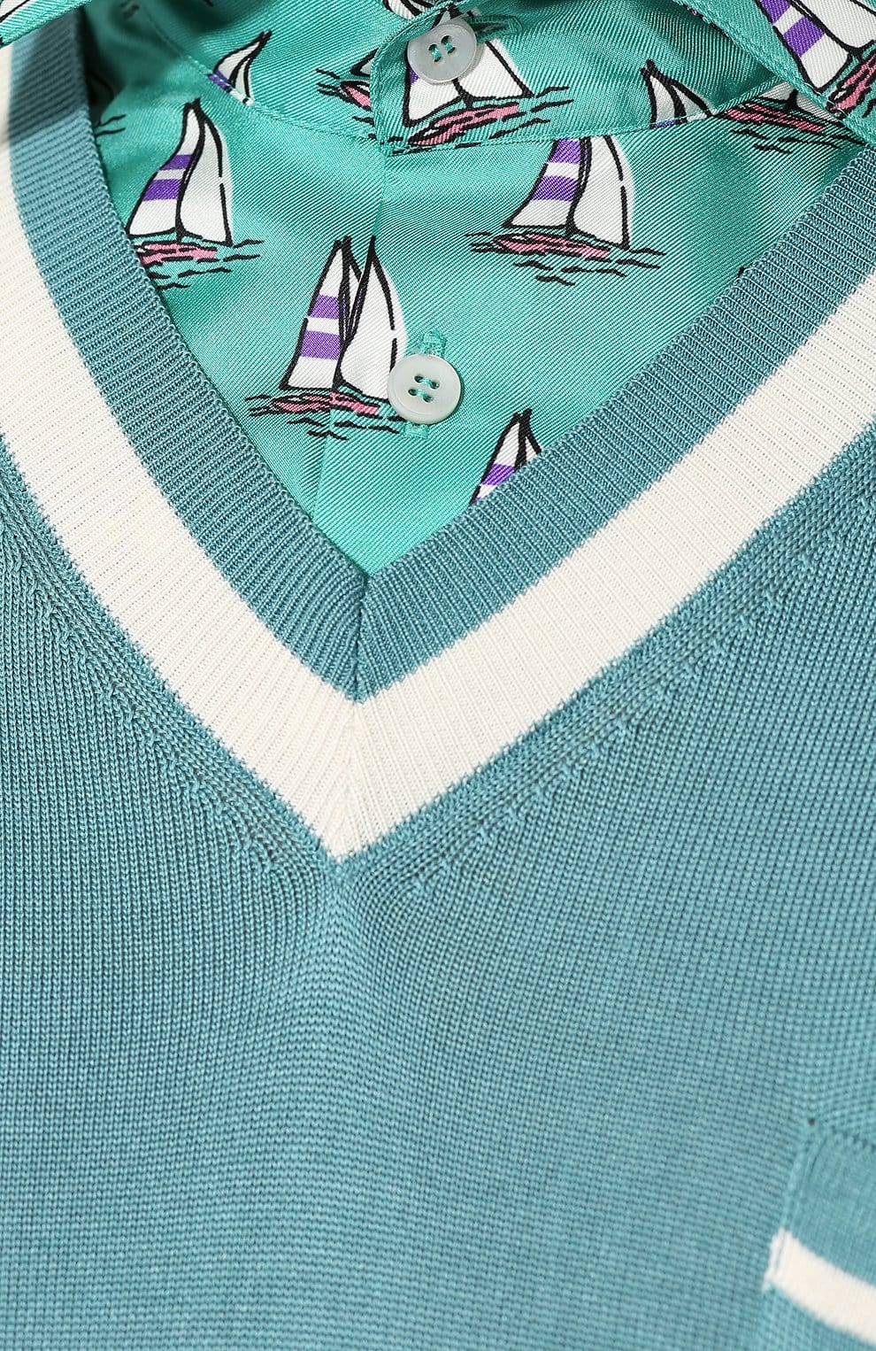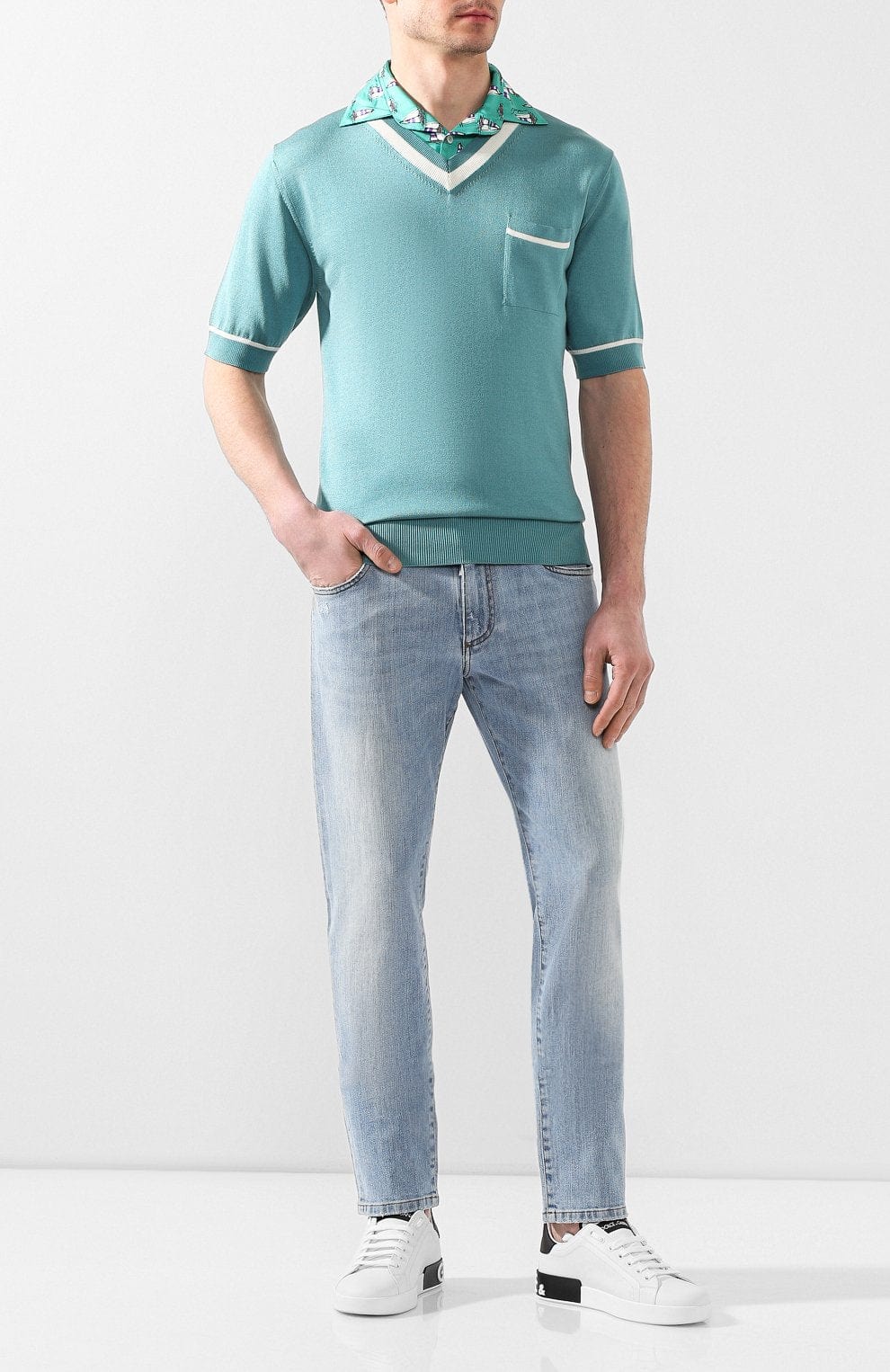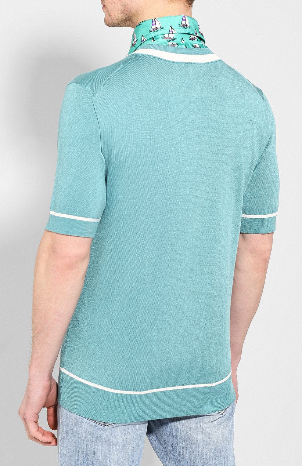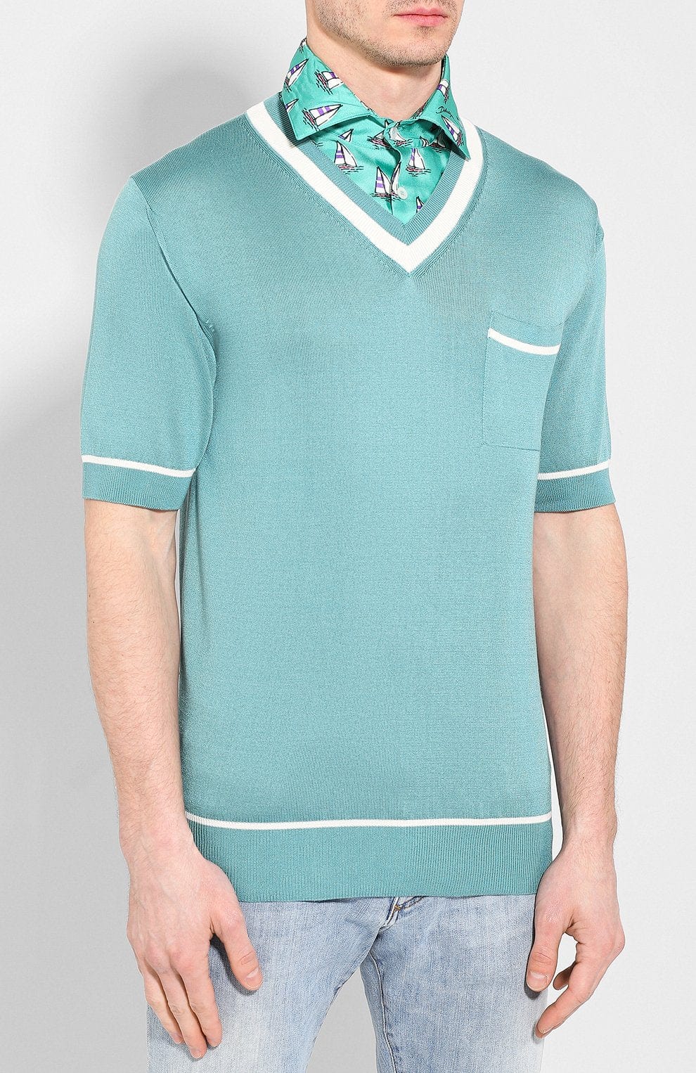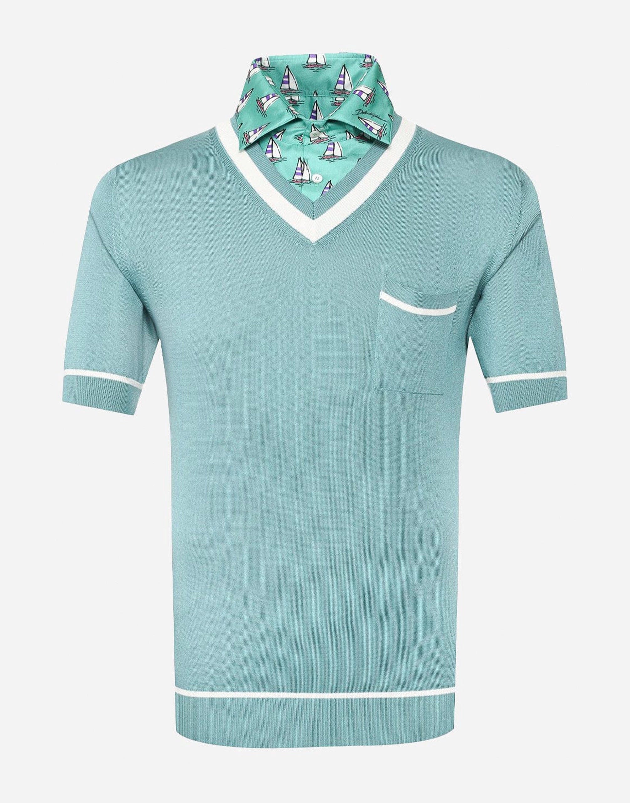 Experience the ultimate blend of style and comfort with our Blue Silk Polo Shirt from Domenico Dolce and Stefano Gabbana. Made with 100% silk in two unique textures, this lightweight shirt is perfect for any season. The thin fabric collar features a stylish ship print, while the soft silk body keeps you cool and comfortable. Upgrade your wardrobe with this must-have piece.