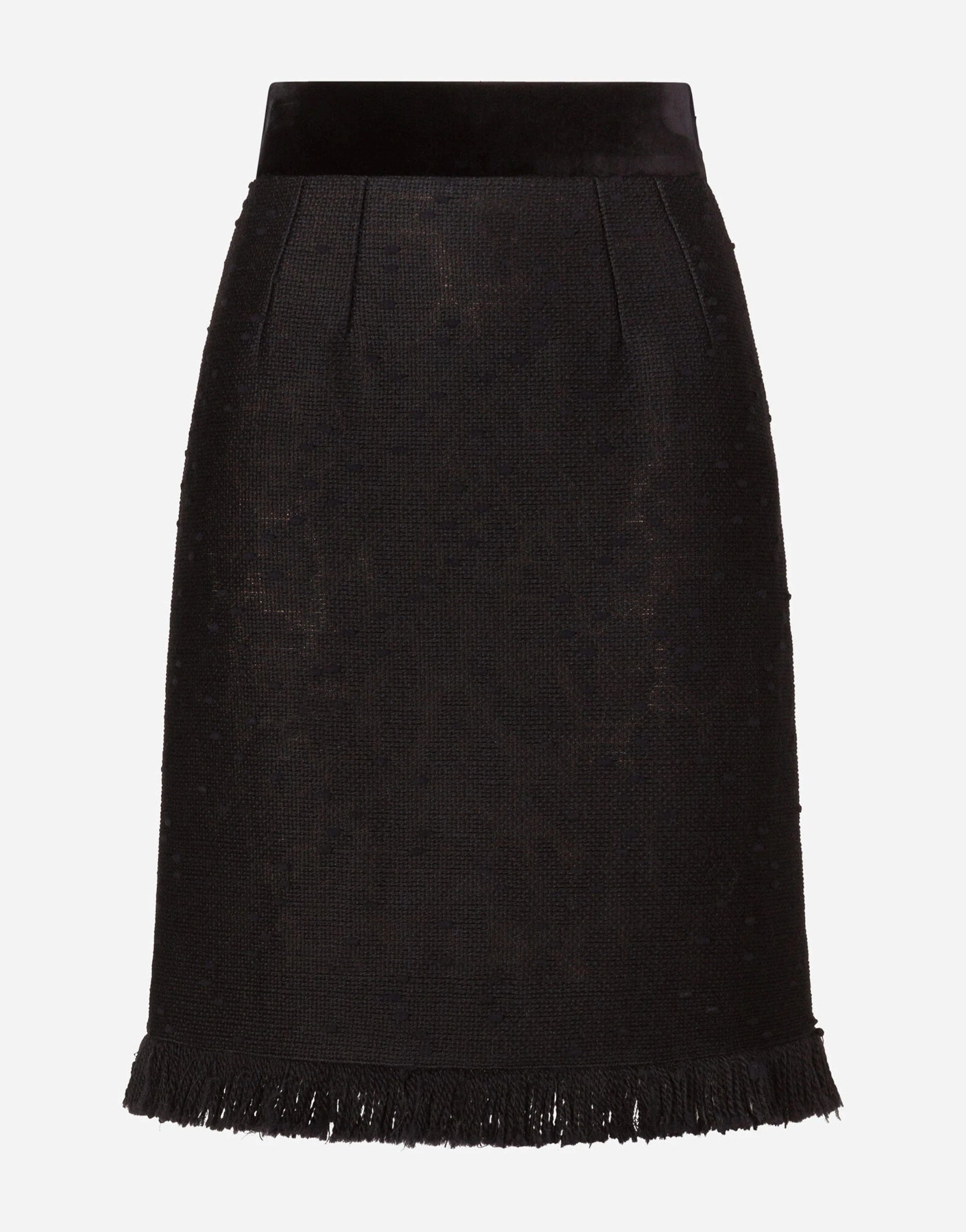 Expertly crafted from a luxurious blend of wool and silk bouclé, the Dolce & Gabbana Midi Skirt exudes timeless elegance. Its pencil cut and delicate fringed hem add a touch of sophistication, making it the perfect match for the coordinating jacket. Elevate any look with this classic piece.