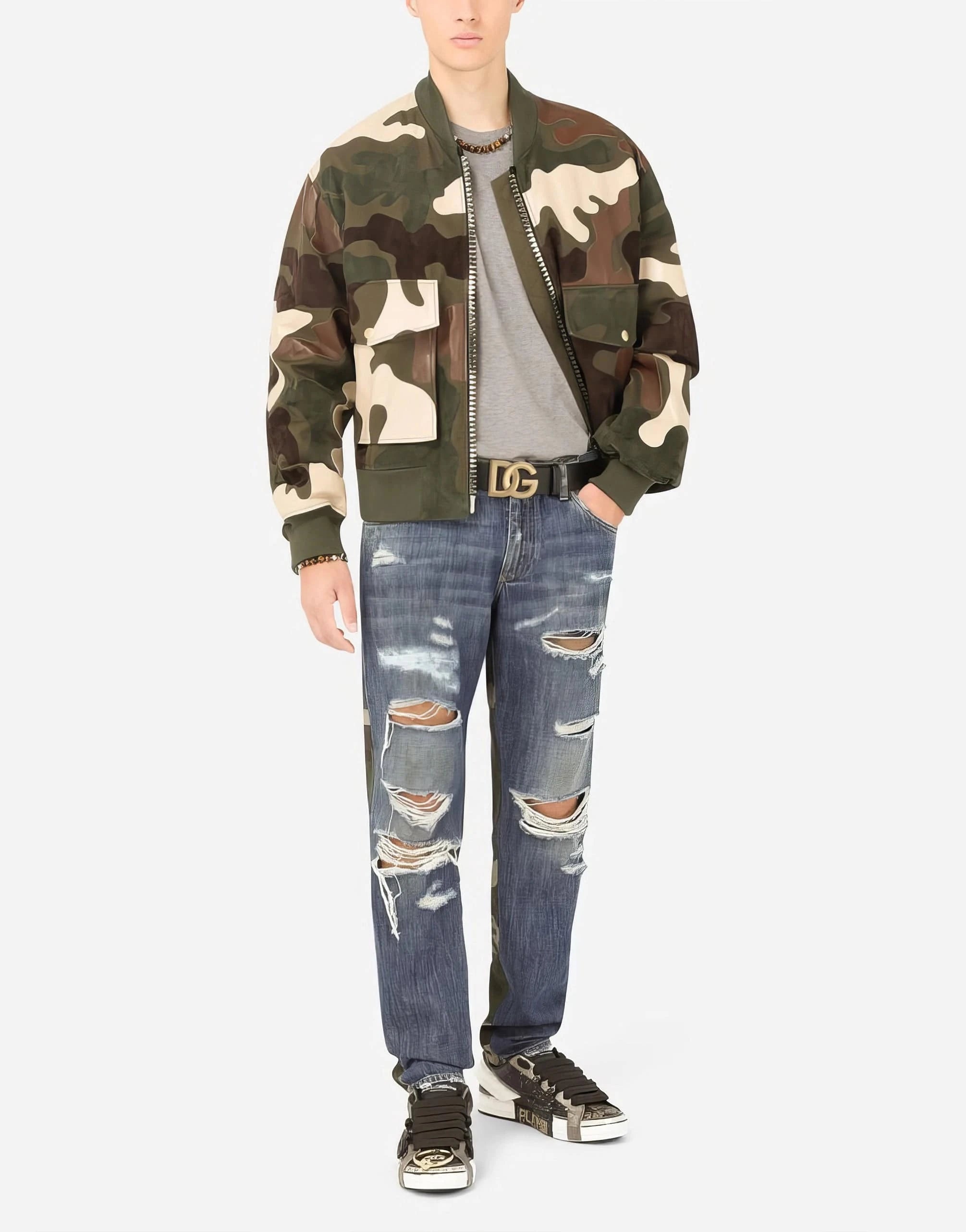 The Camouflage Intarsia Leather Jacket from Dolce & Gabbana's "Reborn to Live" Collection offers a contemporary twist on traditional natural mimesis, with a sporty aesthetic that merges contrasting styles. Made from lambskin and cotton and featuring a camouflage-effect intarsia and metal logo plate, this jacket exudes joy and positivity.