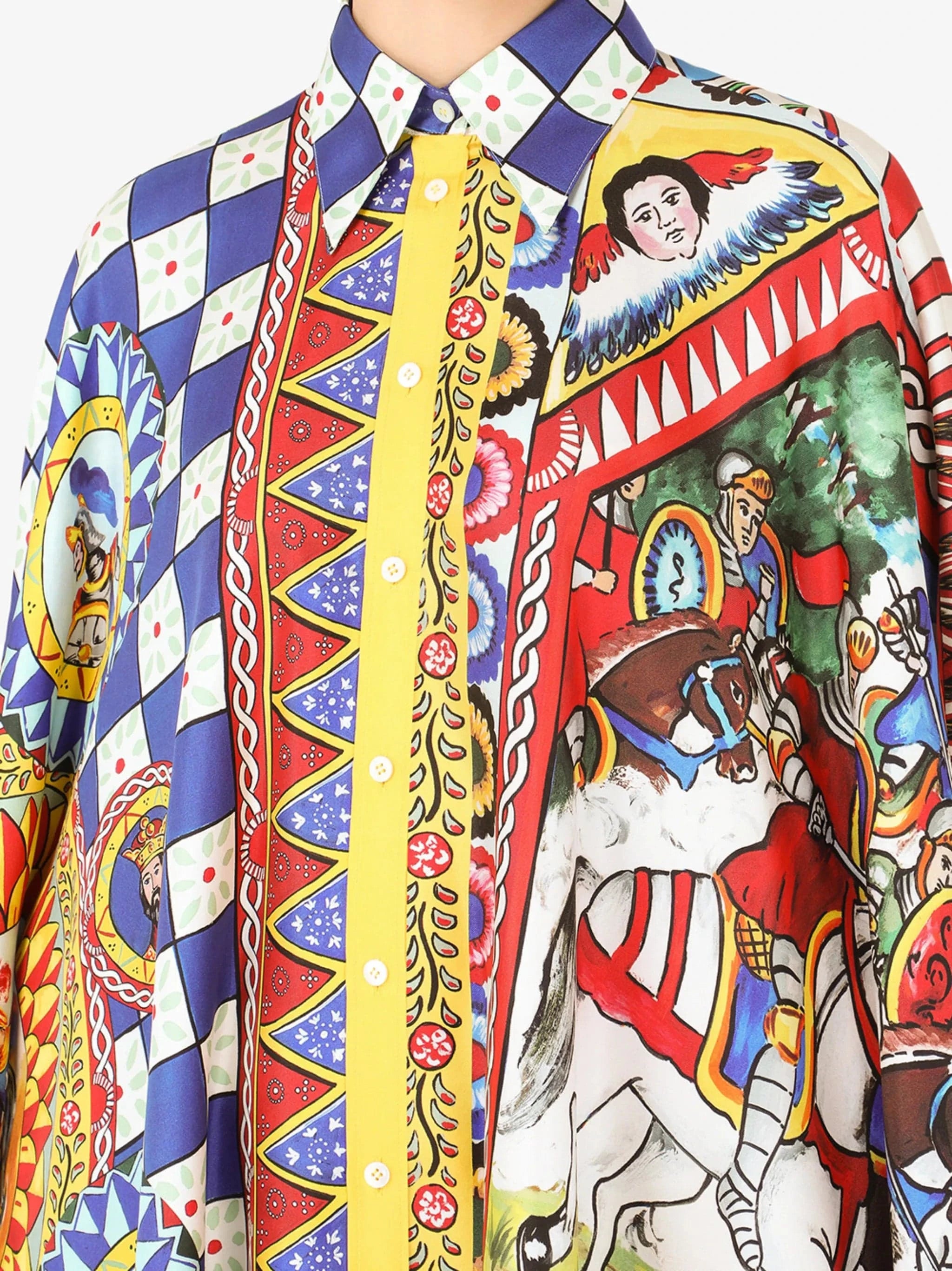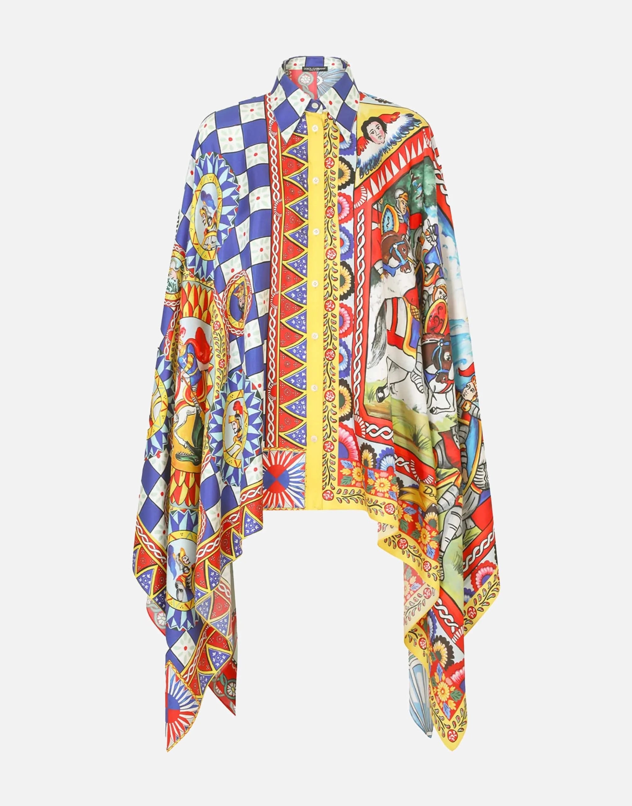 The Carretto-print twill shirt by Dolce & Gabbana elevates your wardrobe with its vibrant homage to Sicilian tradition. Crafted from luxurious silk twill, this shirt boasts an exquisite mixed print design, embodying a refined aesthetic. Its unique poncho cut ensures a chic and comfortable fit, making it a standout piece in any discerning woman's collection.