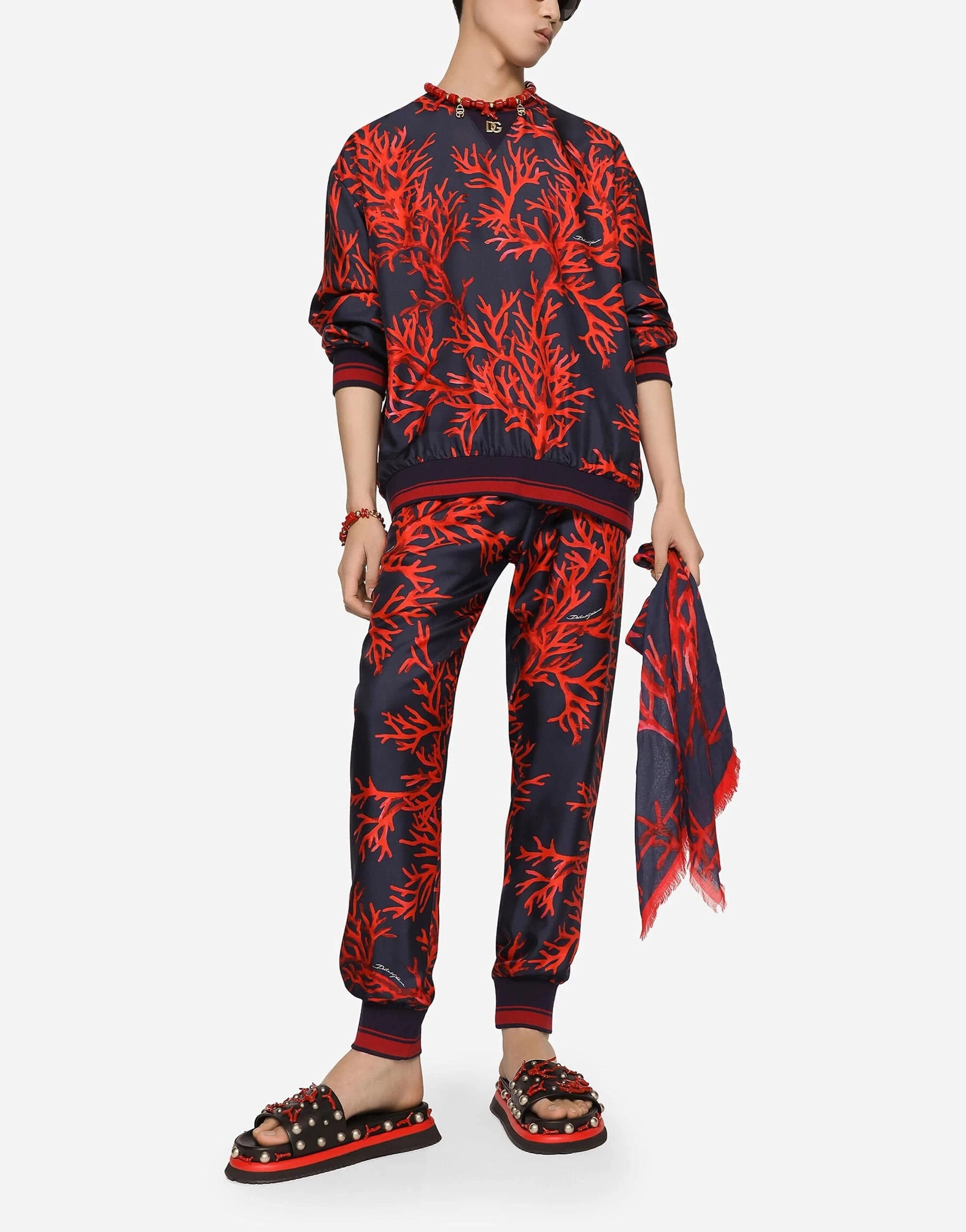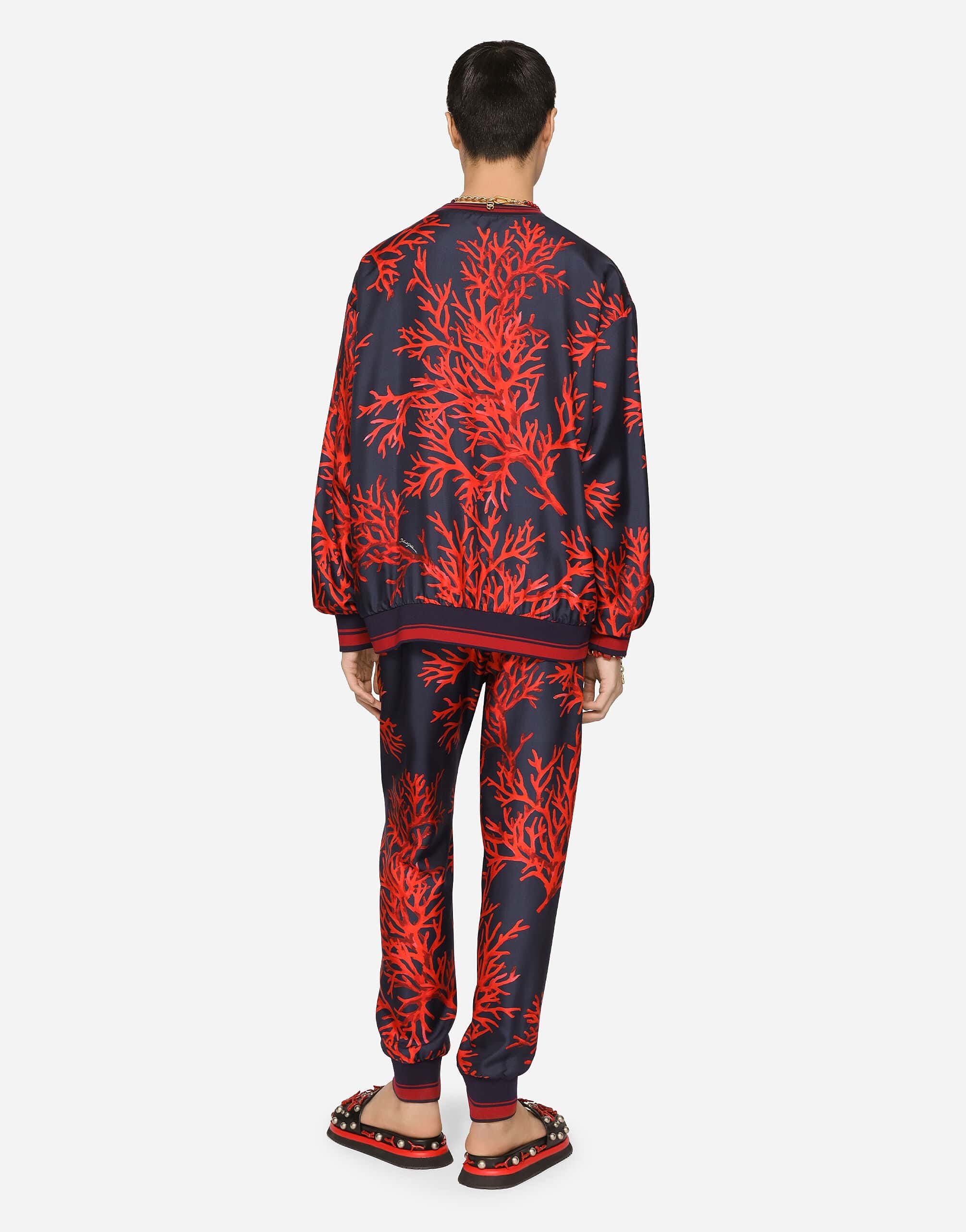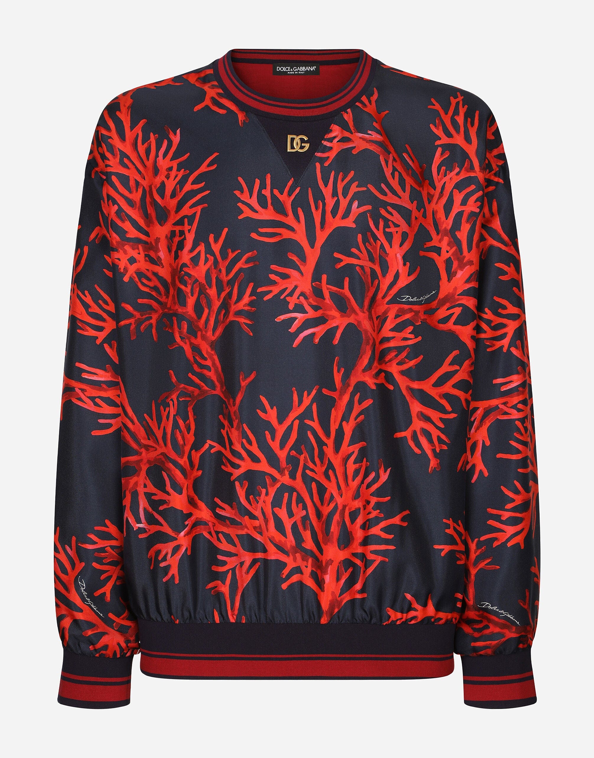 In the "Corallo" Collection by Dolce & Gabbana, the coral-print silk sweatshirt emerges as a tribute to the ocean's timeless allure and the vibrant mystique of red coral. Crafted from 100% silk, this men's sweatshirt melds the fluidity of iridescent colors with a contemporary silhouette that exudes understated masculine sensuality. Adorned with a discreet metal DG patch, the design embodies a fusion of artistic expression and luxurious materials, making it an essential piece for those who appreciate the art of refined elegance.