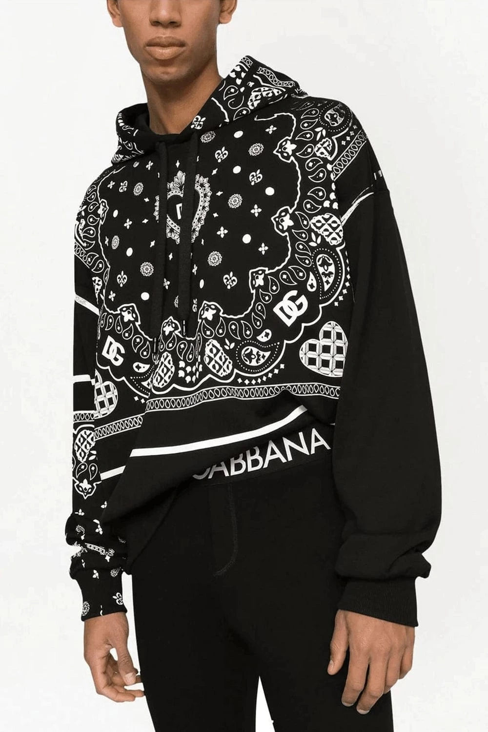 The Dolce & Gabbana cotton hoodie elevates casual luxury with its distinctive bandana print, a nod to timeless motifs reimagined for the contemporary wardrobe. Crafted with meticulous attention to detail, this piece effortlessly blends comfort with style, making it an essential addition to the discerning gentleman's collection.