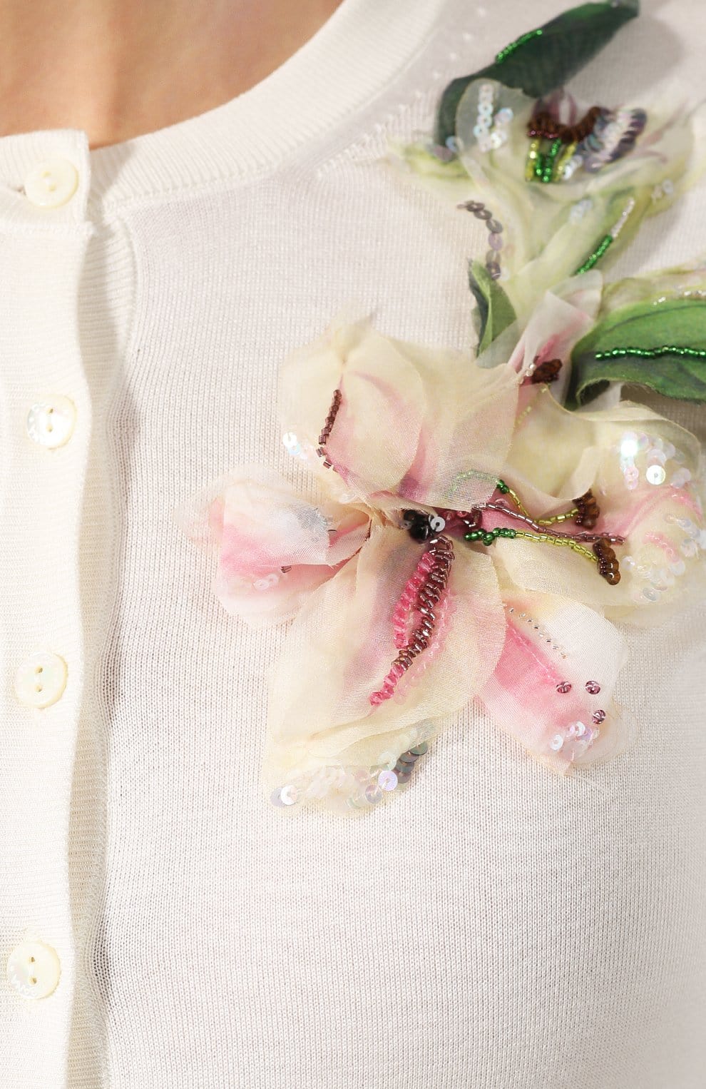Crafted from a luxurious silk blend, the Dolce & Gabbana Floral-Appliqué Cardigan features delicate floral embellishments on the chest. Elevate your wardrobe with this elegant and stylish piece, perfect for any occasion.