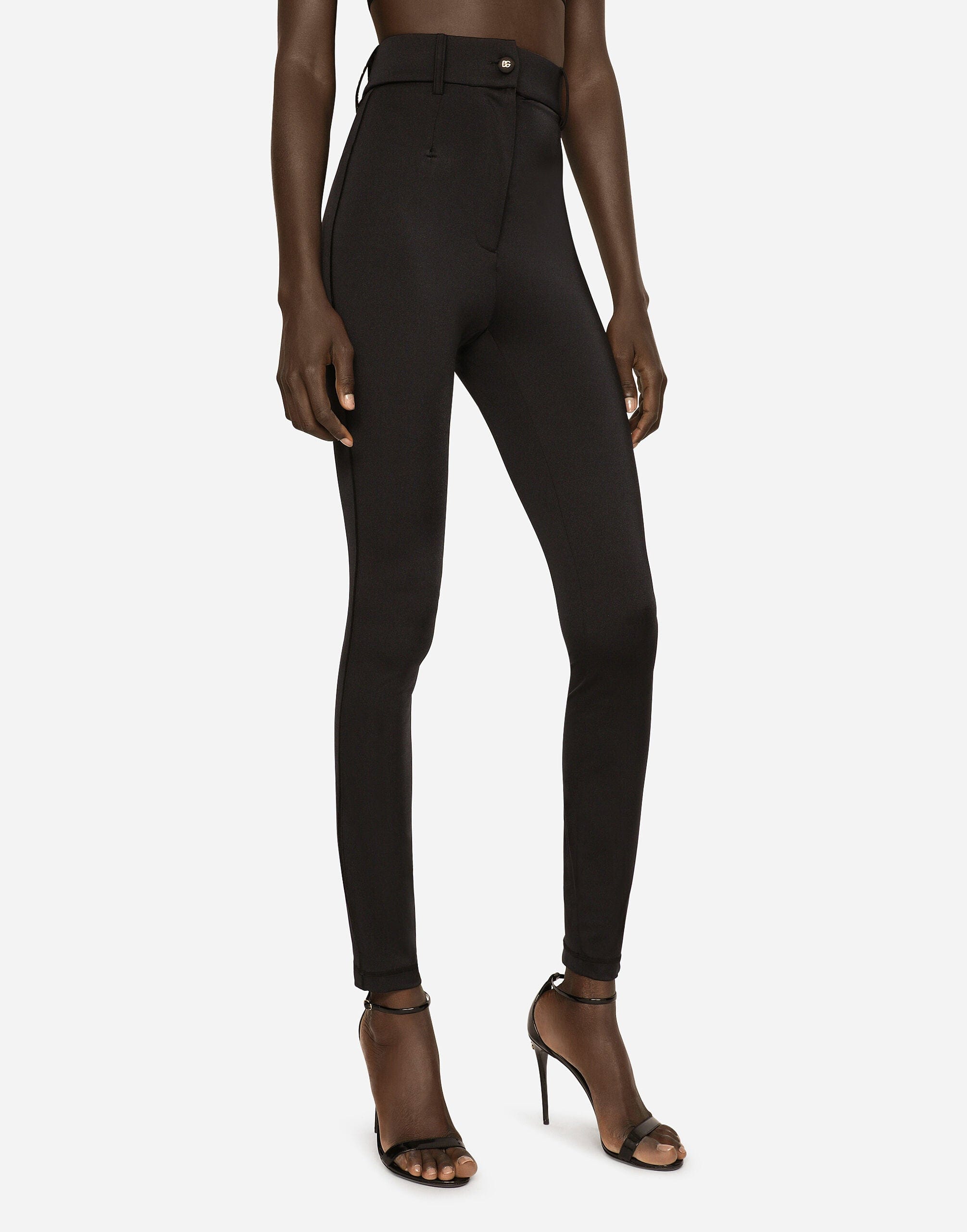 These Dolce & Gabbana logo trousers are made from stretch jersey for a flattering, form-fitting shape. The high waist and covered dg logo add a touch of femininity, making these trousers a versatile addition to any wardrobe. With a zipper and button closure, these leggings are both stylish and practical for any season.