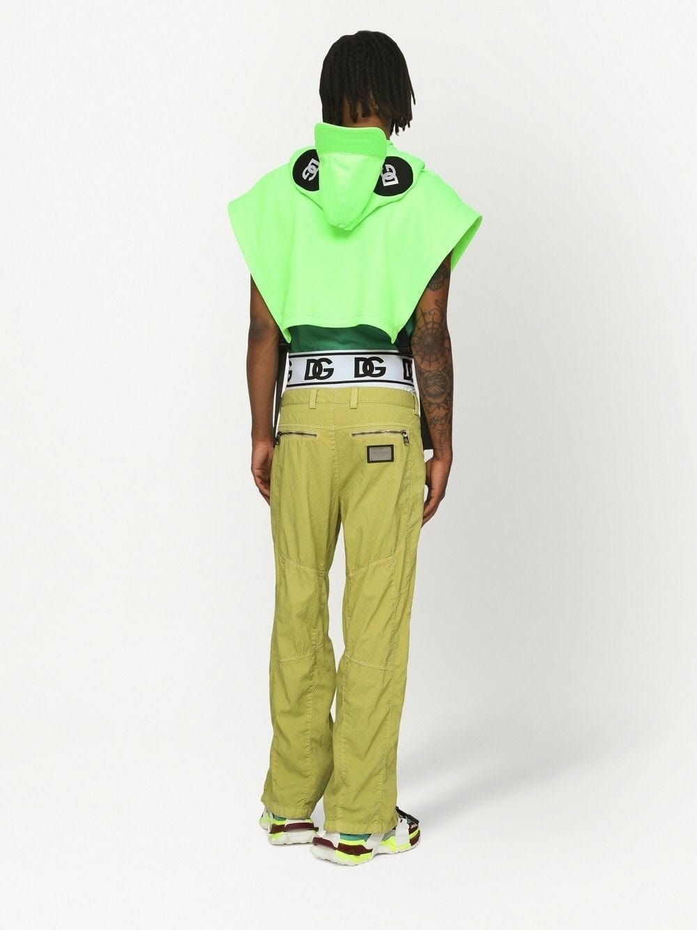 Introducing the Logo-Print Cropped Hoodie by Dolce & Gabbana. Flaunt your style with the brand's fluorescent green logo print and side buckle fastening. Stay comfortable with the drawstring hood and sleeveless design. This cropped hoodie is a must-have addition to your wardrobe.
