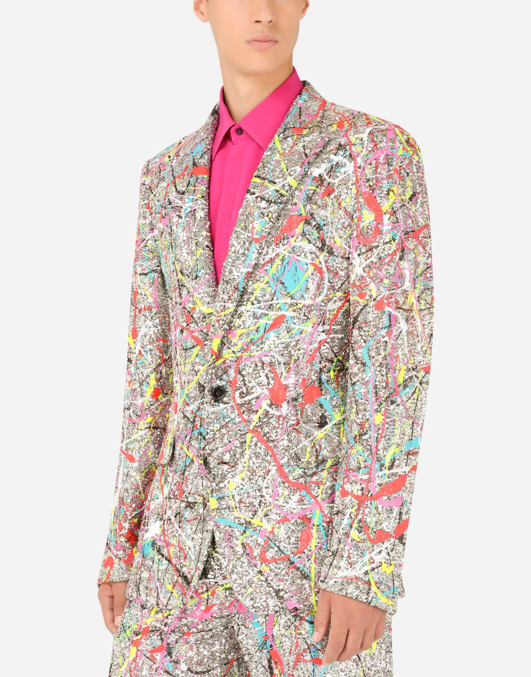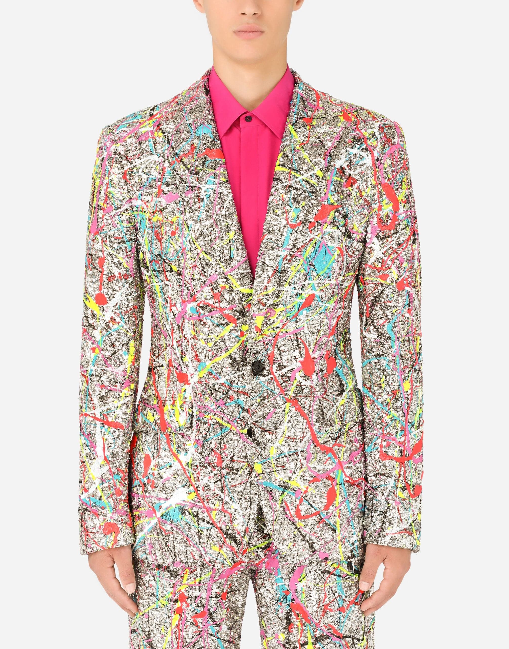 Sparkle in style with our Splash-Print Sequined Blazer Jacket from Dolce & Gabbana. Inspired by life, positivity, and folklore, this single-breasted jacket features a color splash print made from distinctive luminaries. Adorned with embroidery, crystals, sequins, and jacquard designs, it's a truly iconic piece that celebrates individuality and self-expression.