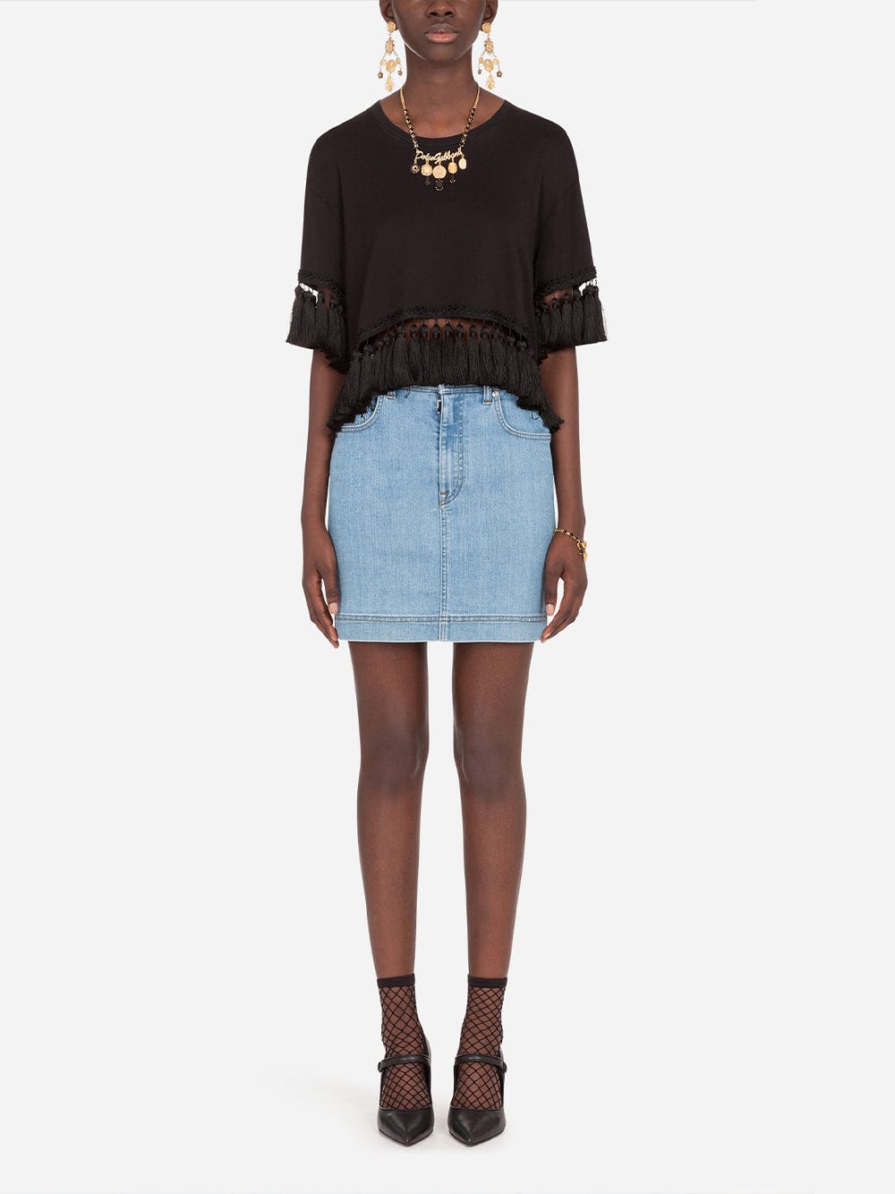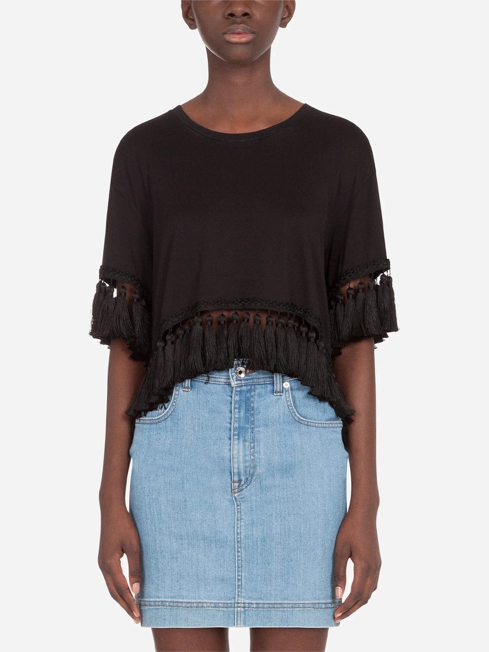 Experience the elegance of the Dolce & Gabbana Tassel With Trimmings Jersey T-shirt. Crafted from soft black cotton, this T-shirt features a ribbed round neck, cropped sleeves, and a trim of delicate tassels, perfect for adding a luxurious touch to any outfit. Perfect for those who appreciate effortless sophistication.