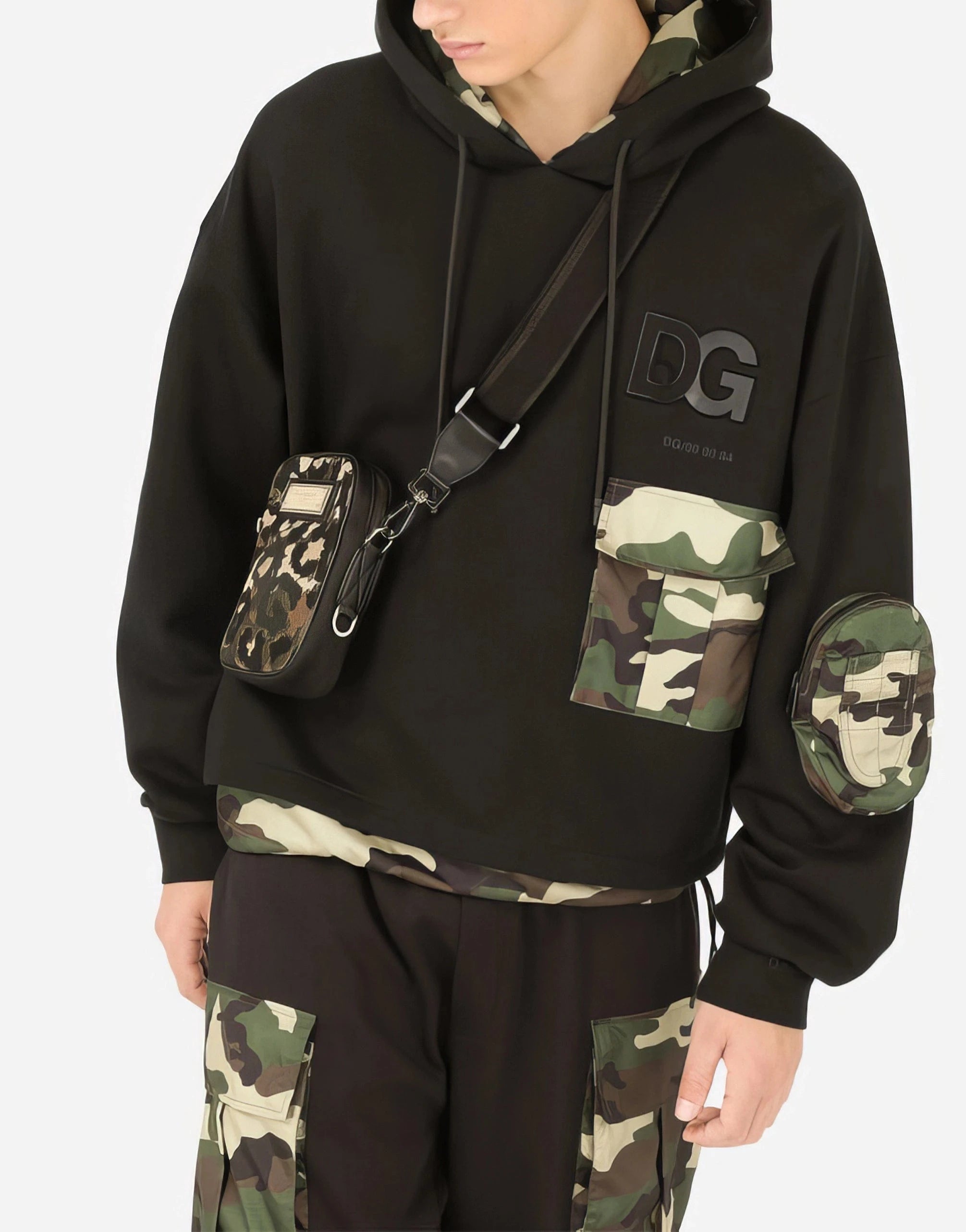 Upgrade your style with the Dolce & Gabbana Camouflage Jacquard Crossbody Bag. This practical and compact bag is designed for bold and fashionable individuals. Featuring a new branded plate and two plated finishes, it also includes an adjustable and detachable tape strap for versatility. Perfect for any occasion, this bag is a must-have for your collection.