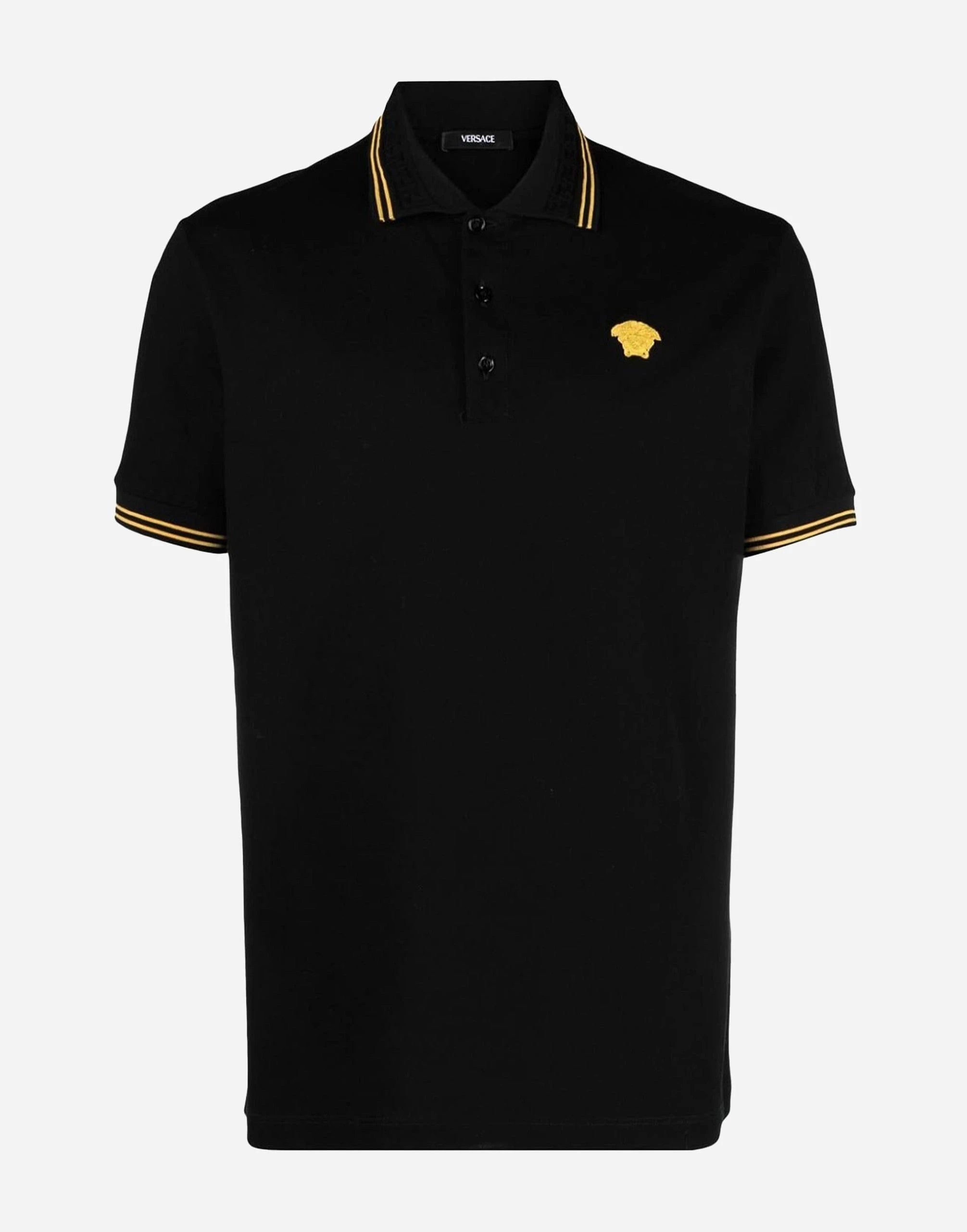 The Medusa-Embroidered Polo Shirt by Versace seamlessly marries classic elegance with contemporary edge, featuring meticulous Greca detailing and an exquisitely embroidered Medusa head motif. Crafted in a luxurious black pique weave, this refined piece boasts a tailored button placket, short sleeves, and a polished straight hem, embodying the quintessential allure of men's designer polo shirts.